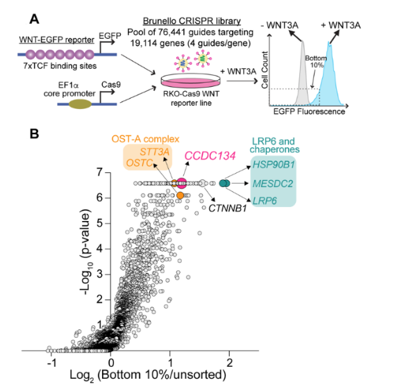 使用基于熒光的轉錄報告基因,在人類細胞系(RKO)中進行了全基因組的功能缺失CRISPR/Cas9篩選,以鑒定響應WNT3A激活WNT/β-catenin信號所需的基因。篩選發現了許多已知的WNT信號成分: β-catenin, LRP6 (WNT配體的共受體),以及兩種ER伴侶,MESD和HSP90B1,促進LRP5和LRP6 (LRP5/6)在ER中的折疊。篩選還發現了三個與WNT信號不明確相關的基因:CCDC134、STT3A和OSTC。