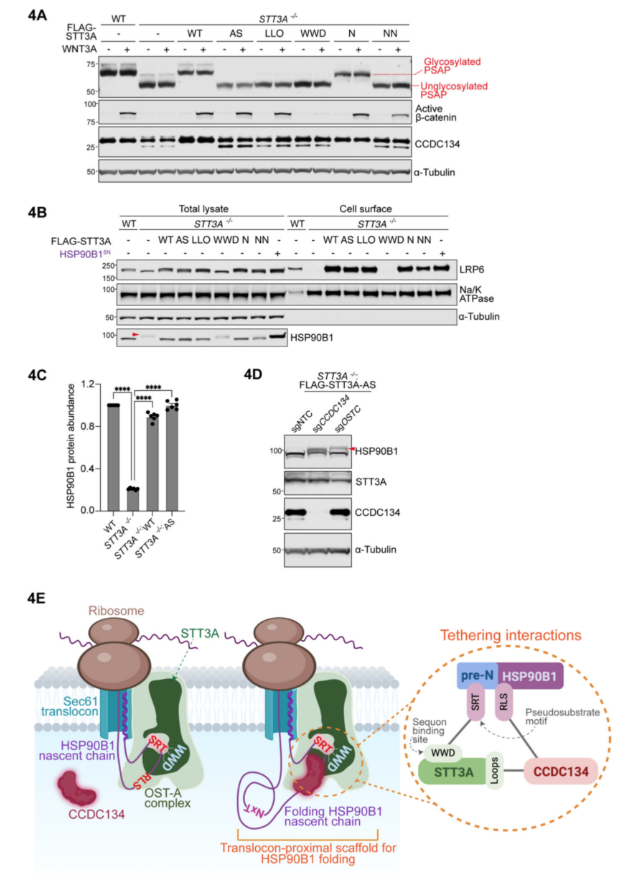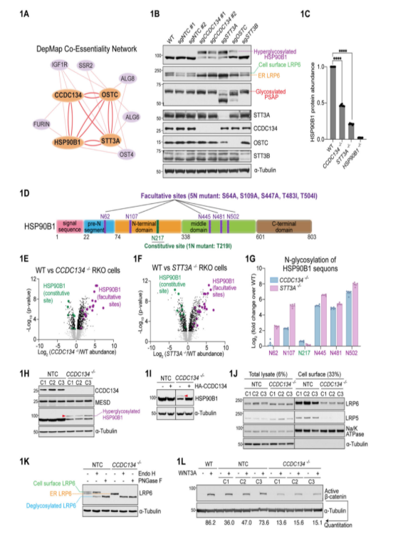 敲除STT3A(而不是STT3B)導致HSP90B1的高度糖基化和去穩定化。CCDC134和OSTC的敲除也導致HSP90B1的高度糖基化和不穩定,此外,STT3A、CCDC134或OSTC的缺失降低了細胞表面WNT共受體LRP6的豐度。高度糖基化的HSP90B1不能折疊成功能蛋白,導致其被ERAD機制標記和降解。N-糖蛋白學顯示STT3A和CCDC134與HSP90B1的N-糖基化具有高度特異性和一致性。